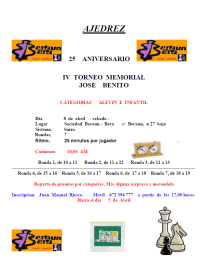 Ayer sábado, organizado por el club de ajedrez Beraun Bera Xake Elkartea de Errenteria y dirigido por el amigo Juan Manuel Riesco se celebró el IV Torneo Memorial José Benito. Un suizo de 7 rondas, a 25 minutos por jugador y partida, en la que participaron 27 chavales, divididos en tres categorías: Benjamín, Alevín e Infantil.