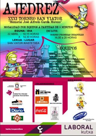 AJEDREZ 22 de abril de 2018 318 × 448 Fin de semana pleno de ajedrez. El viernes cena fin de liga. El sábado Campeonato Escolar Individual de Gipuzkoa e incio del XIV Open de Primavera de Gros. El domingo, Campeonato de Gipuzkoa Escolar por Equipos y el XXXI torneo de San Viator de Vitoria con presencia marlaxkera