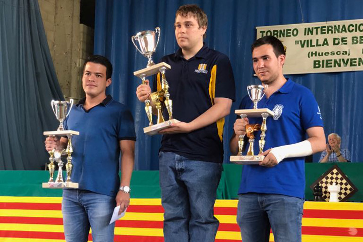 podio 16 de julio de 2018 720 × 480 Benasque 2018: victoria del GM húngaro Peter Prohaszka. Buena actuación de nuestros compañeros Andoni Orube, Ramon Nogues e Ibai Dorronsoro. Amplia participación de jugadores con licencia Vasca y Navarra Eduardo Iturrizaga (subcampeón), Peter Prohaszka (campeón) y Daniel Forcén (tercero) | Foto: cortesía de los organizadores del Abierto de Benasqu