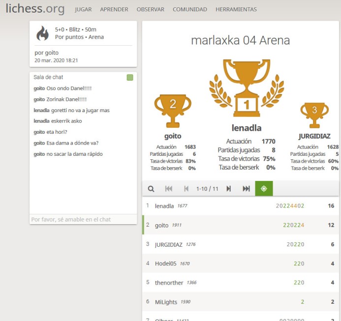 Tras el día de descanso ayer para celebrar el Día del Padre, hoy se ha jugado el tercer torneo para los alumnos de nuestra Xake Eskola. En esta ocasión (información competa aquí del torneo ) hemos celebrado en cerrado, y en el mismo han particiapdo 11 de nuestros alumnos usuarios de Lichess. Los chalvaes se lo han pasado genial y ha habido muchas sorpresas en los resultados. La esperiencia ha sido muy positiva.animosa.