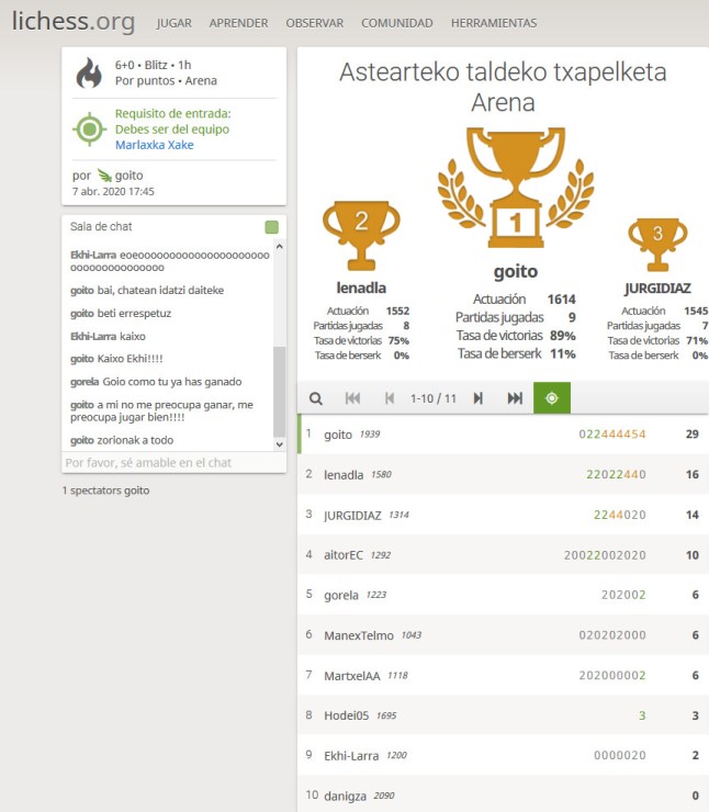 2020-04-07 10 de abril de 2020 646 × 740 Resultados del torneo tras la clase de los martes de nuestra xake Eskola y de La batalla por Equipos AJEDREZVASCO. Esta vez 10º-s, bajamos al grupo b. Y recuerda #YoMeQuedoEnCasa.