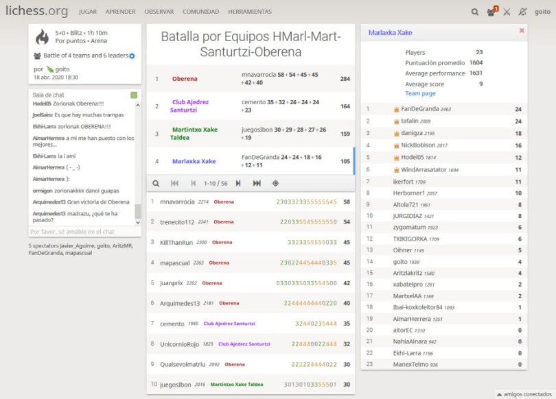 Cuadrangular Euskal Herria 4 online. Hondarribia-Marlaxka (Gipuzkoa) – Martintxo Xake Taldea (Álava) – Club Ajedrez Santurtzi (Bizkaia) y Oberena (Navarra) en lichess. Tras una animada tarde de confraternización la victoria ha sido para el Oberena. Zorionak a todos!!! Y recuerda #YoMeQuedoEnCasa.