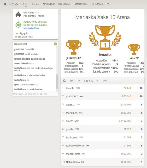 2020-04-21-M10 21 de abril de 2020 613 × 699 Resultados del torneo tras la clase de los martes de nuestra xake Eskola y de La batalla por Equipos AJEDREZVASCO. Cuartos del grupo B por lo que mañana seguimos en el grupo B. Y recuerda #YoMeQuedoEnCasa.