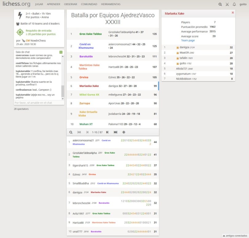 Hoy se ha jugado el torneo del miércoles de la quinta semana de la batalla por Equipos AJEDREZVASCO y en la categoría A, hemos logrado el sexto puesto. Gros XT ha logrado la victoria en el grupo A y Billabona en el B. Antes, No hemos faltado a la cita de la clase de los miércoles por Skype que ha concluido con un animado torneo en lichesS. Por otro lado recordaros que ya tenemos los enlaces para el 3er Open Escolar del próximo domingo. ¡¡¡animaos!!! Y recuerda #YoMeQuedoEnCasa.