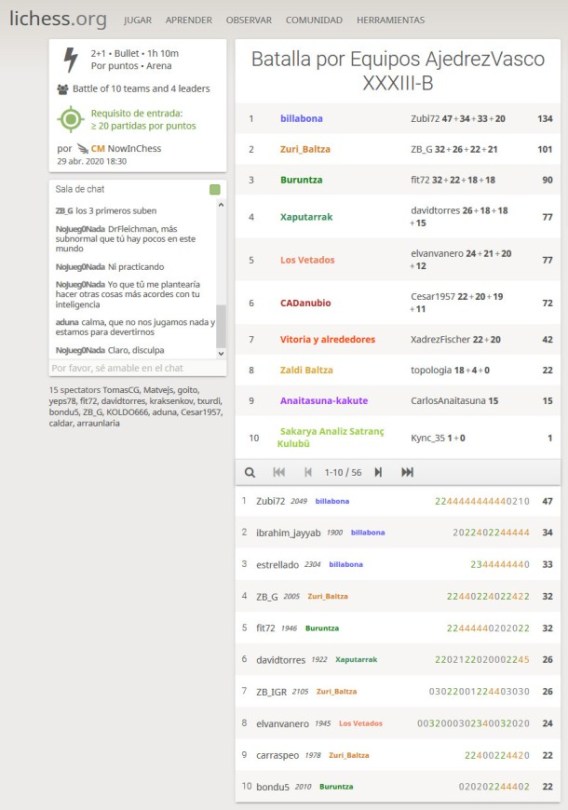 Hoy se ha jugado el torneo del miércoles de la quinta semana de la batalla por Equipos AJEDREZVASCO y en la categoría A, hemos logrado el sexto puesto. Gros XT ha logrado la victoria en el grupo A y Billabona en el B. Antes, No hemos faltado a la cita de la clase de los miércoles por Skype que ha concluido con un animado torneo en lichesS. Por otro lado recordaros que ya tenemos los enlaces para el 3er Open Escolar del próximo domingo. ¡¡¡animaos!!! Y recuerda #YoMeQuedoEnCasa.