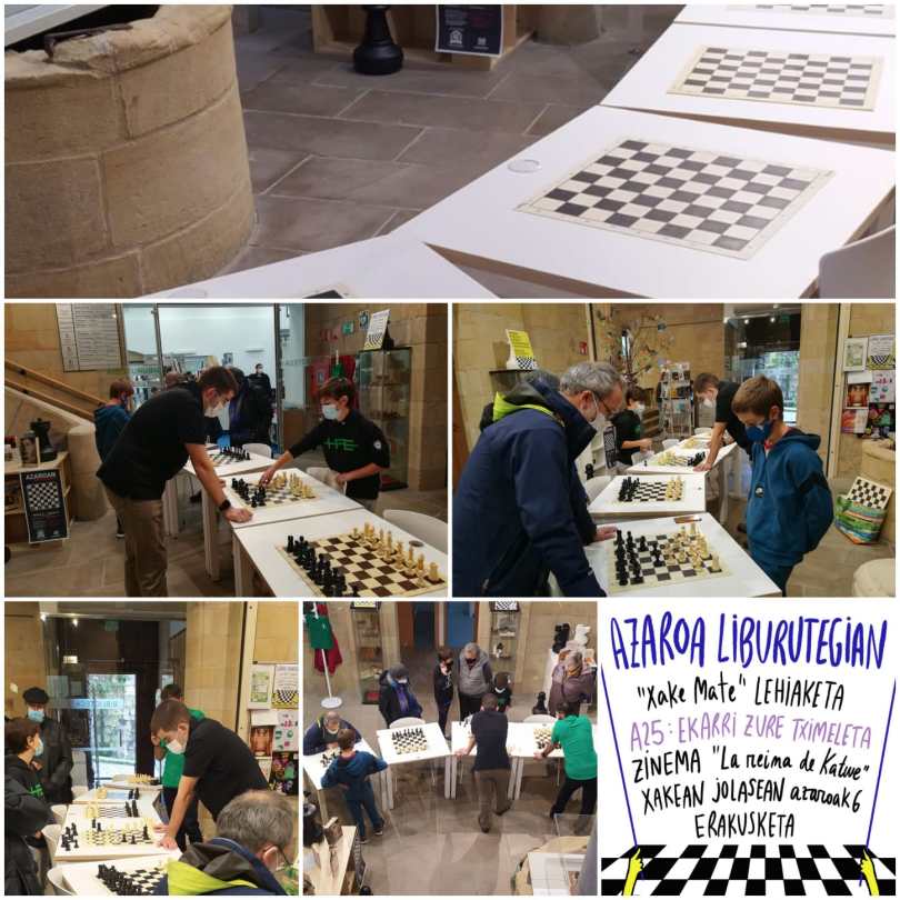 Hoy sábado se ha jugado la penúltima jornada de los campeonatos de Gipuzkoa en las diferentes categorías con buenos resultados de los nuestros. Azaroa Liburutegian: Xakea: El lunes tuvimos la primera jornada del curso abierto y gratuito, luego la preciosa conferencia titulada Ajedrez y Mujer de la mano de Leontxo Garcia, y el viernes, la presentación del comic “Los reinos del ajedrez” con su autor Rafa Nuñez. La proxima semana sigue la programación: tendremos la segunda jornada del curso gratuito, el tercer problema del concurso y la película Reina de Katwe ¡Pásate por la biblioteca, ven!
