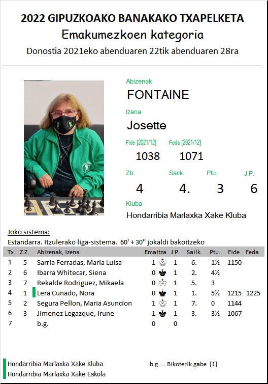 Nora Lera con 12 años campeona de Gipuzkoa femenina y Josette Fontaine, con 72 años, cuarta. Nuestros chicos siguen su participación en los campeonatos de Gipuzkoa: Fernado Hoyos en el veteranos, y Jurgi Diaz, Gabriel Fernández y Milan Pejic ya están inmersos en el Juvenil. Los Tornay, Josu, Haizea y Aritz están jugando en el Open Internacional de Mont de Marsan. Gran resultado de los Tafall en el torneo Navideño de Zumaia, con premio para Gorka al mejor sub16.