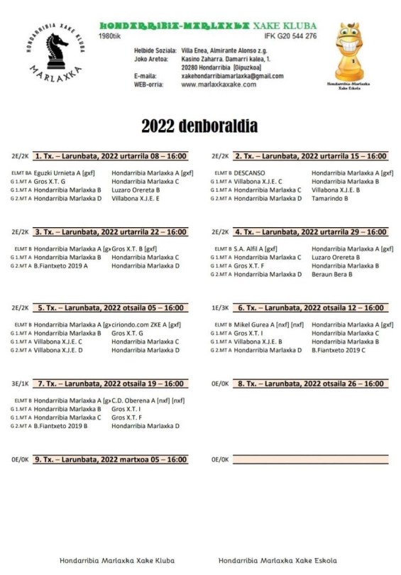 eb3e85e1-7821-4ad1-b02e-7ad29c06e1ce 8 de enero de 2022 870 × 1248 El próximo sábado 8 de enero, comenzarán las competiciones por equipos: tendremos un equipo en Liga Vasca, dos en primera Gipuzkoana y uno en segunda provincial. ¡A disfrutar Espíritu marlaxkero para todos y todas!