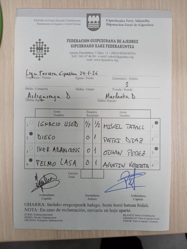 WhatsApp Image 2026-01-24 at 18.43.52 25 de enero de 2026 1204 × 1600 A pesar del mal tiempo este sábado, hemos tenido mucho Ajedrez: 3.ª jornada de los campeonatos por equipos de Euskadi y Gipuzkoa y del Torneo de Invierno de Navarra. Recordaros que mañana no habrá Campeonato Juvenil Individual de Gipuzkoa, ¡Espíritu Marlaxkero! 💪🏻♟️