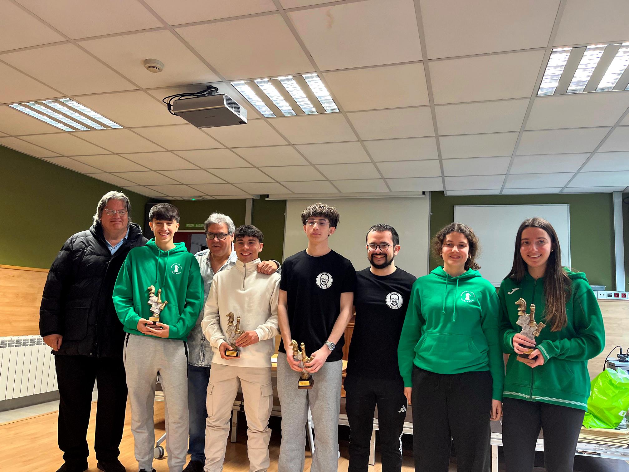 Muy buen trabajo de los alumnos de nuestra Xake Eskola y compañeros en este campeonato de Euskadi por edades👏🏻 . Iker Tafall Villanueva campeón en Juvenil (ya son cuatro las txapelas que lleva en diferentes categorías), nuestra maestra Nora Lera Cuñado 15ª en la general ha sido la 2ª fémina en la misma categoría. En el Cadete salíamos animados con opciones de podio, pero no se ha logrado y la victoria final ha sido para Daniel Barros Pecina del club  Taula.  Gorka Tafall Villanueva ha sido 10º,  Jon Diaz Etxaide ha sido 16º, Beñat Sagarzazu Fernández el 20º, Oier Echaide Oscoz el 26º, y Oihan Perez Urcelayeta el 31º. Por su parte nuestra txikimaestra Ainhitze Jauregi Belategi, en su primera participación se ha desenvuelto con desparpajo y soltura, logrando 2 puntos que le han valido para terminar en el puesto 42º. En esta categoría la txapela ha sido para Saúl Martínez Mateos del club Santurtzi y Khrystyna Yatseiko ha logrado ser tercera y primera fémina. Enhorabuena a tod@s 💪💚👍