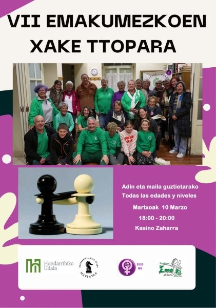 Os recordamos que siguiendo por la apuesta del talento femenino el club de ajedrez Hondarribia Marlaxka, coincidiendo con la Semana de las Mujeres y en colaboración con Emeki, el próximo 10 de marzo a las 18:00 horas en el Kasino Zaharra, organizaremos la 7ª Ttopara Femenina de Ajedrez de Hondarribia, iniciativa abierta a las mujeres de cualquier edad y niveles ajedrecísticos.  Se trata de un Torneo amistoso femenino de ajedrez con el objetivo de disfrutar juntas del ajedrez y de paso, proclamar y celebrar el día 8 de marzo.