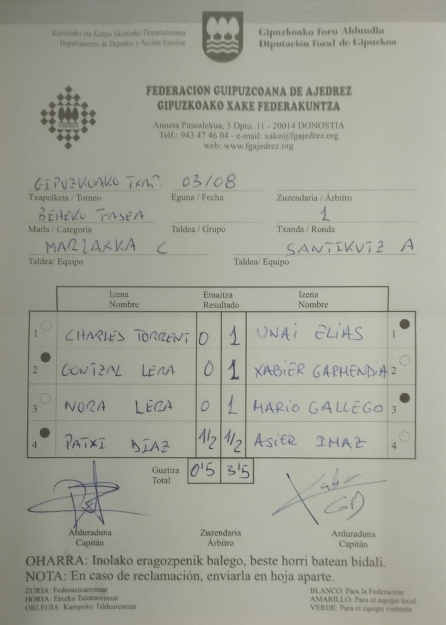 HONDARRIBIA-MARLAXKA C  terminamos séptimos de esta liga y en las próximas semanas tendremos que jugar el play off de permanencia. Hoy hemos jugado contra el equipo Berkoa de Elgoibar Xake Kluba y el empate ha estado muy cerca. Nora ha logrado la victoria y el capitán del equipo Patxi el empate que ha dado los puntos a los nuestros en esta jornada. Gran trabajo de Beñat y Agustin, juventud y veteranía que esta vez no ha tenido premio.