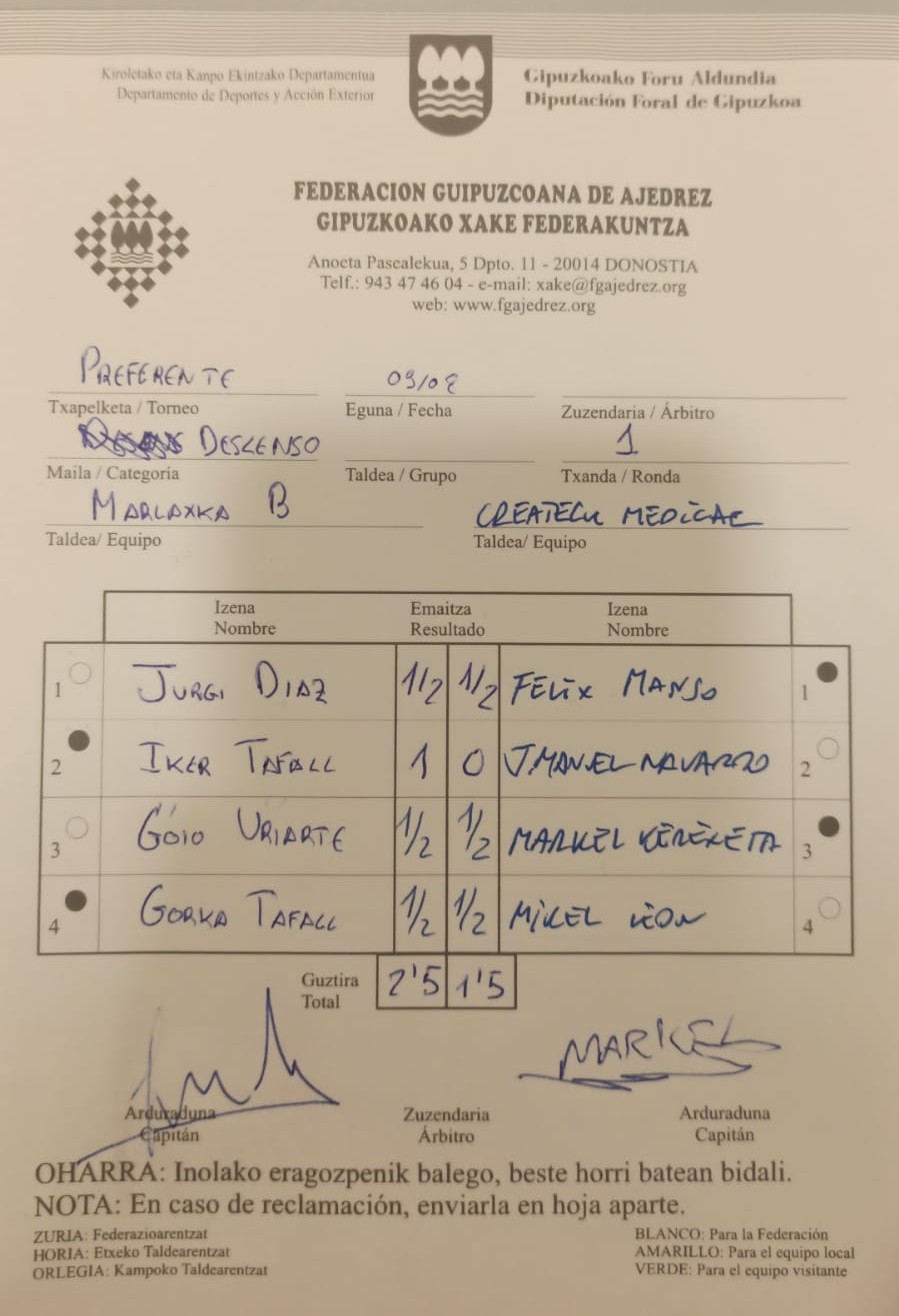 Hondarribia Marlaxka B terminamos la liga en puestos de descenso y en próximas semanas tendremos que jugar el play off por la permanencia. Hoy hemos jugado contra los amigos de Createch Medical de Elgoibar ligrando la victoria por 2,5-1,5